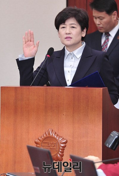강은희 여성가족부 장관 후보자가 7일 오전 서울 여의도 국회에서 열린 인사청문회에 출석해 선서를 하고 있다.
