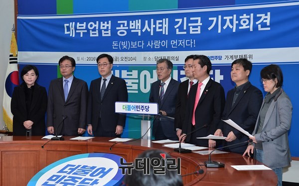더불어민주당이 8일 오전 국회 당대표회의실에서 대부업법 공백사태 긴급 기자회견을 열고, 문재인 당 대표가 발언을 하고 있다.