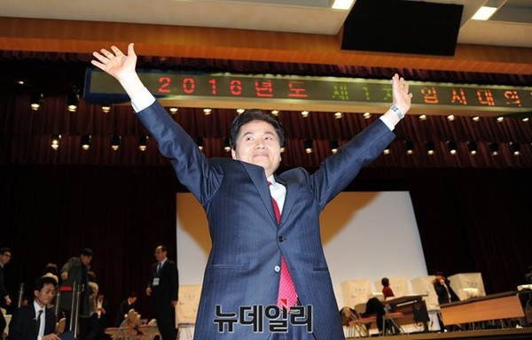 농협중앙회는 12일 서울 중구 새문안로 농협중앙회 대강당에서 열린 제23대 농협중앙회장 결선 투표에서 김병원(62) 전 나주남평농협 조합장을 선출했다. 당선 확정 후 김병원 당선인이 손을 들어 인사를 하고 있다.