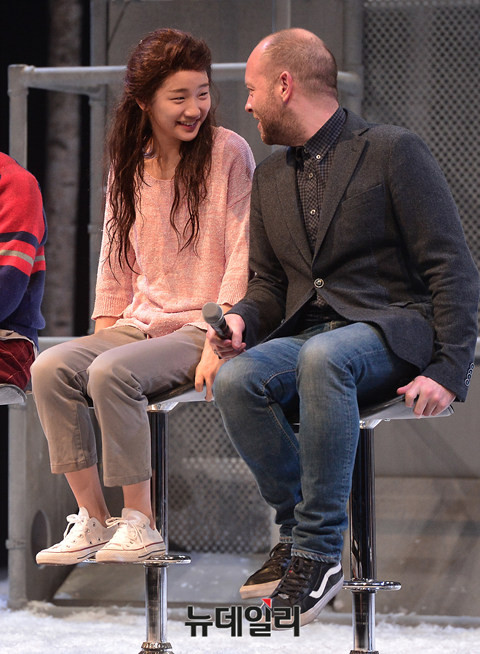 연극 '렛미인(Let The Right One In)' 프레스콜이 21일 오후 서울 서초구 예술의전당 CJ토월극장에서 진행됐다. 배우 박소담과 연출을 맡은 존 티파니가 대화를 나누고 있다.