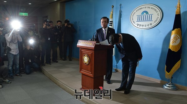 더불어민주당 주승용, 장병완 의원이 13일 오전 국회 기자회견장에서 탈당기자회견을 열고, 더불어민주당을 탈당했다. 주승용 전 최고위원이 기자회견문 낭독후 인사를 하고 있다.