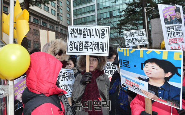대한민국어버이연합이 13일 오후 서울 종로구 일본대사관 앞에서 기자회견을 열고, "위안부 사과 협상 방해하는 정대협(한국정신대문제대책협의회)과 효녀연합을 즉각해체하라"고 주장했다.