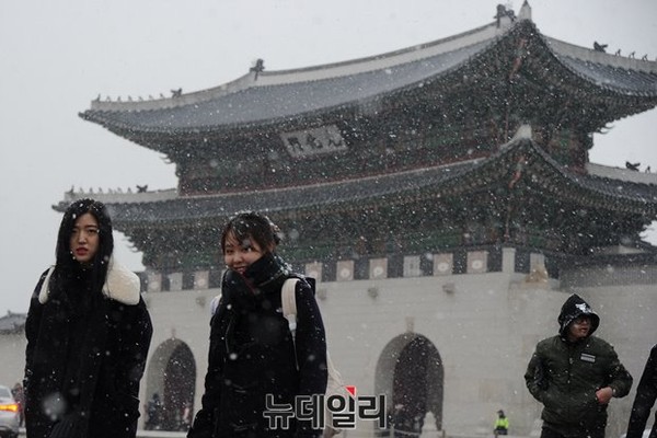 전국에 눈소식이 예보된 가운데 13일 오후 서울 종로구 세종대로 광화문광장에 시민들이 우산도 없이 눈을 맞으며 발걸음을 재촉하고 있다.
