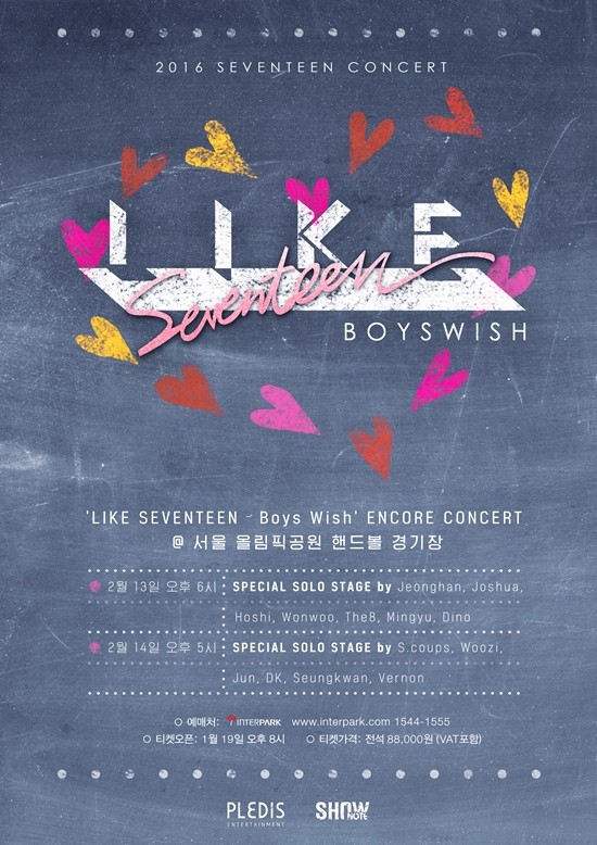 그룹 세븐틴이 오는 13일, 14일 양일간 올림픽공원 SK올림픽핸드볼경기장에서 앙코르콘서트를 개최한다.세븐틴은 지난해 12월 열린 콘서트에서 유닛별 로테이션 스페셜 스테이지를 선보였다. 이번 앙크로콘서트에서는 솔로스테이지를 통해 그동안 세븐틴 활동을 통해 볼 수 없었던 멤버 개개인의 매력을 담아낼 예정이다. 또한 발매한 앨범 수록곡 외에도 미공개 등도 선보일 예정이어서 기대감이 높아지고 있다.세븐틴 소속사 플레디스는 “지난 콘서트에 참여하지 못한 팬들과 다시 한 번 더 공연을 관람하고 싶다는 팬들의 지속적인 요청으로 인해 앙코르콘서트를 열게 됐다. 이번 콘서트를 통해 지난 첫 콘서트보다 발전된 모습을 보여줄 예정이다. 밸런타인데이 초콜릿처럼 달콤하고 매력적인 세븐틴의 모습을 기대해달라”라고 당부했다.세븐틴 콘서트 티켓은 오는 19일 오후 8시부터 인터파크에서 예매할 수 있다.