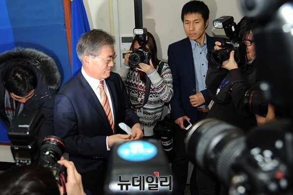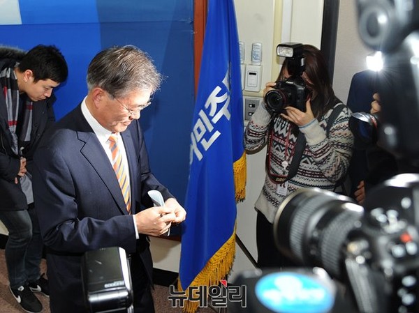더불어민주당 문재인 대표가 14일 오후 서울 여의도 국회에서 김종인 선대위원장 영입 관련 기자회견을 마친 후 당대표회의실을 나서고 있다.