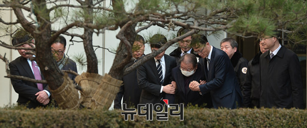 효성그룹 조석래 회장이 14일 오후 서울중앙지법에서 열린 1심 재판에서 유죄를 선고 받고 법원을 나서고 있다.