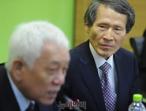 국민의당 창당준비위원회 확대기획조정회의가 18일 오전 서울 마포 당사에서 열린가운데 한상진 공동창당위원장이 김한길 상임 부위원장의 발언을 듣고 있다.