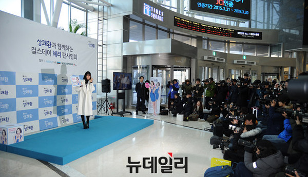 큐원 상쾌한 전속모델 걸스데이 혜리 팬 사인회가 19일 오전 서울 영등포구 타임스퀘어 아트리움A에서 열렸다. 이날 팬 사인회 행사에 참석한 혜리가 포토타임을 가지고 있다.