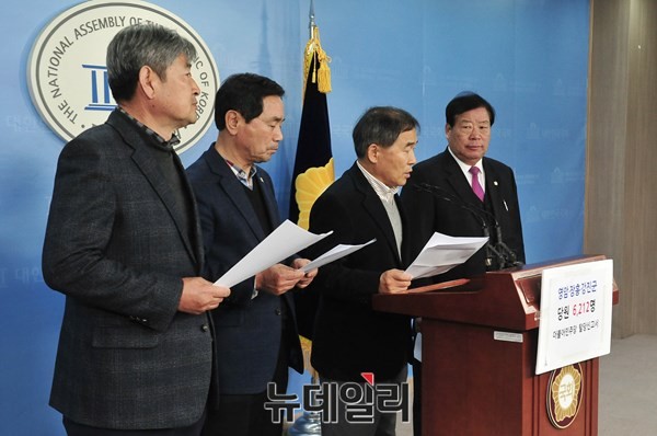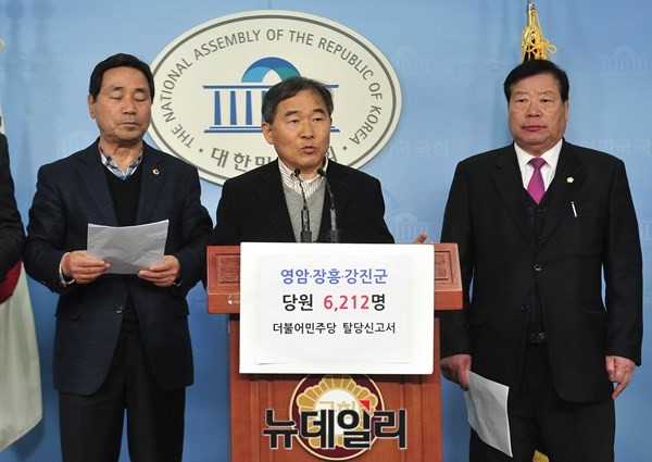 국민의당 황주홍 의원(사진 맨 오른쪽)이 19일 국회에서 기자회견을 열고 전남 영암·장흥·강진 지역 당원 6,212명의 탈당 기자회견을 진행하고 있는 가운데, 김광준 전남도의원이 성명서를 낭독하고 있다.