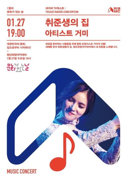오는 27일 취업준비생의 집인 청년희망 아카데미에서 1월 집콘 '취준생의 집-희망을 노래하다'를 진행하며, 가수 거미가 직접 100여명을 찾아가 생생한 라이브 음악으로 따뜻한 위로와 응원을 건넬 예정이다.