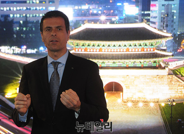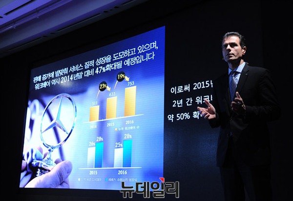 메르세데스-벤츠 코리아는 20일 오전 서울 중구 신라호텔 영빈관에서 신년 기자간담회를 개최했다. 2015년 9월 취임한 디미트리스 실라카스(Dimitris Psillakis)사장이 2016년 주요 경영 목표를 밝히고 있다.