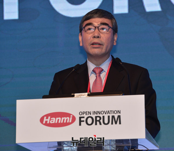 '제1회 한미 오픈이노베이션포럼'이 21일 오후 서울 신라호텔에서 진행된 가운데 한미약품 이관순 사장이 개회사를 하고 있다.