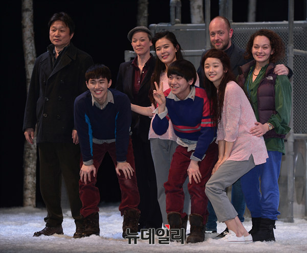 연극 '렛미인(Let The Right One In)' 프레스콜이 21일 오후 서울 서초구 예술의전당 CJ토월극장에서 진행됐다. 기자간담회 후 출연배우와 연출진이 단체사진 촬영을 하고 있다.