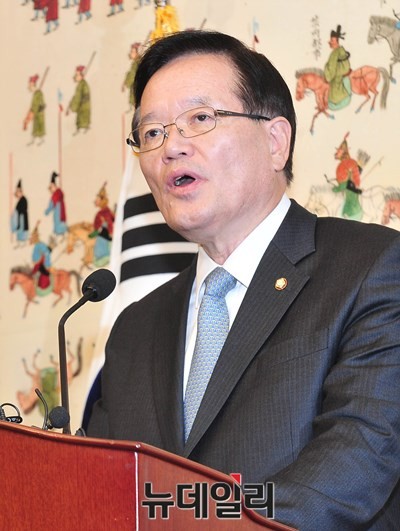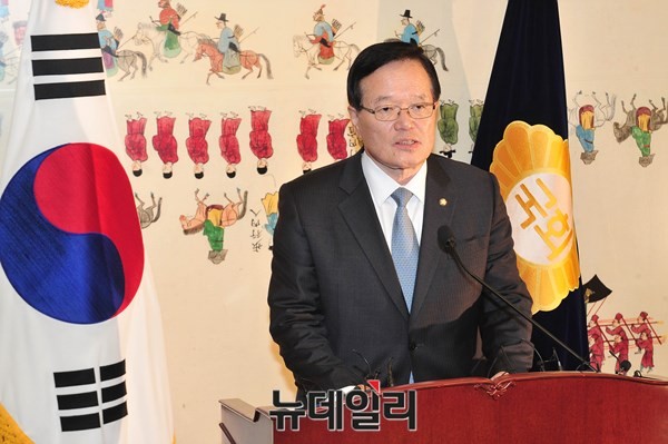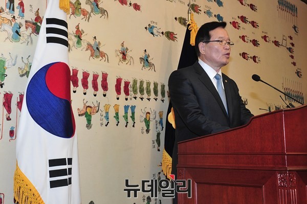 정의화 국회의장이 21일 오후 서울 여의도 국회 접견실에서 국회 선진화법, 선거구 획정 등 정국 현안과 관련한 기자회견을 갖고 있다.