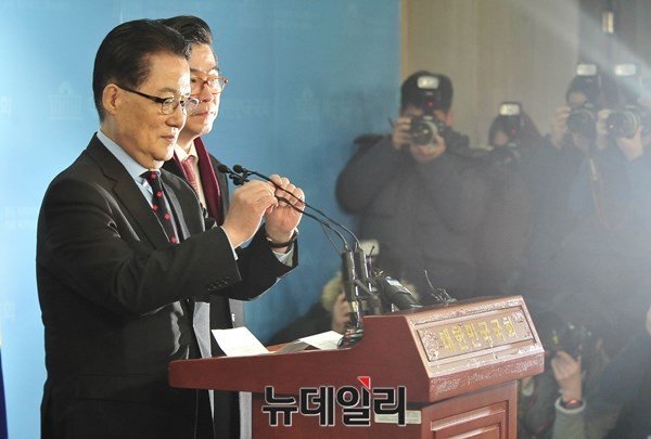 더불어민주당 박지원 의원이 22일 오전 서울 여의도 국회 정론관에서 목포지역 시의원들과 탈당 기자회견을 갖고 있다.
