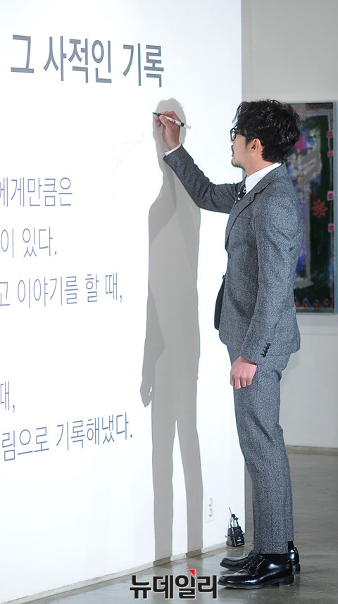 배우 하정우가 22일 오후 서울 강남구 신사동 호림아트센터에서 열린 네스프레소와 함께하는 '#WhatElse' 전시회에 참석해 전시 서문에 사인을 하고 있다.