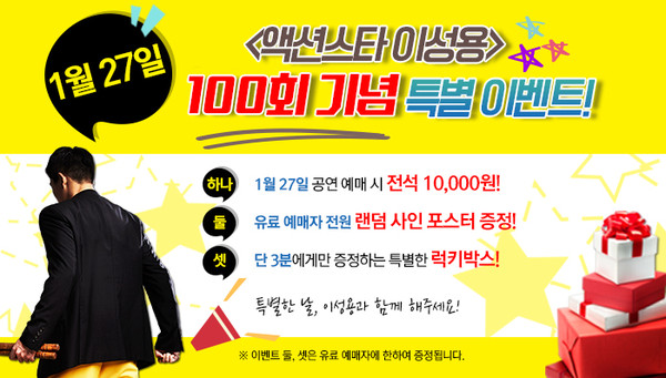 연극 '액션스타 이성용'이 초연 100회를 앞두고 특별한 이벤트를 펼친다.오는 27일 초연 100회를 맞이하는 '액션스타 이성용'은 이를 기념하기 위해 할인 혜택과 선물 증정 이벤트를 마련했다. 먼저 100회를 맞이하는 1월 27일 공연은 전석 1만원에 예매할 수 있는 할인 혜택을 제공한다.또, 100회 공연 유료 예매자 전원에게는 출연 배우들의 랜덤 사인이 담긴 공연 포스터 1매씩 증정하며, 그 중 추첨을 통해 단 3명에게 다양한 선물을 한데 모은 럭키박스를 선물할 예정이다.정범철 연출은 "초연임에도 불구하고 관객들의 지지와 사랑을 많이 받아 어느덧 100회 공연을 진행하게 돼 감사한 마음뿐이다. 100회 기념 이벤트가 관객들에게 조금이라도 보답할 수 있는 시간이 되었으면 한다. 남은 공연도 끝까지 많이 오셔서 응원해 주시길 바란다"고 소감을 전했다.연극 '액션스타 이성용'은 꿈도 목표도 없는 청년백수 '이성용'이 우연히 액션스쿨에 다니게 되면서 액션을 통해 자신의 진정한 꿈을 찾아가는 이야기를 화려한 액션과 유쾌한 코미디로 그려낸 작품이다.지난해 11월 초연 개막 이후 누구에게나 존재하는 청춘에 대해 다시 한 번 생각하고 공감하는 시간을 선사하며 연일 호평을 받고 있다. 오는 2월 28일까지 대학로 지구인씨어터에서 공연된다.[연극 '액션스타 이성용' 100회 기념 이벤트 이미지, 사진=지구인]