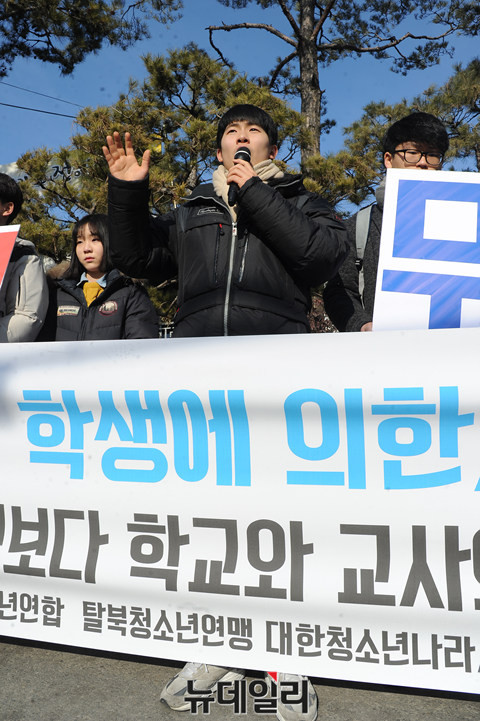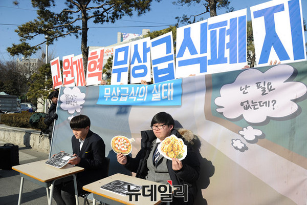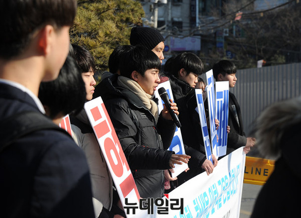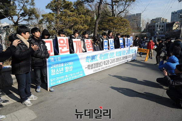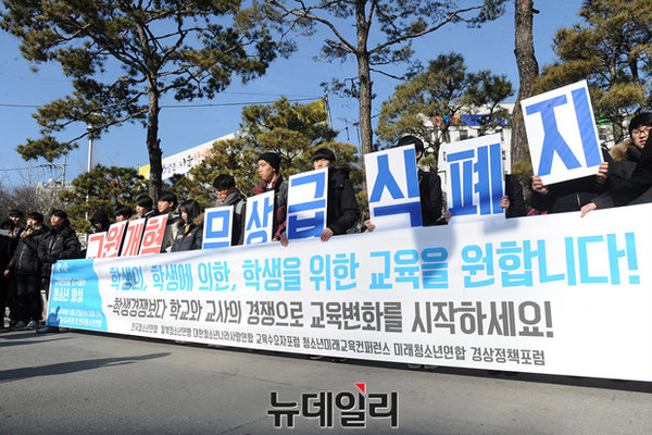 전국청소년연합 등 청소년단체 회원들이 27일 오후 서울 종로구 서울시교육청 앞에서 기자회견을 열고 '교원 개혁과 전면무상급식 폐지' 등을 촉구하고 있다.