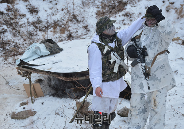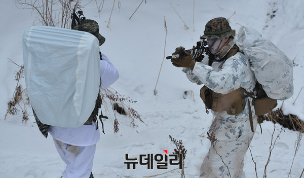 해병대 수색대대와 美 해병대 3사단 소속 수색중대의 '한미연합 설한지 훈련'이 28일 강원 평창 황병산에 위치한 해병대 산악종합훈련장에서 언론에 공개됐다.