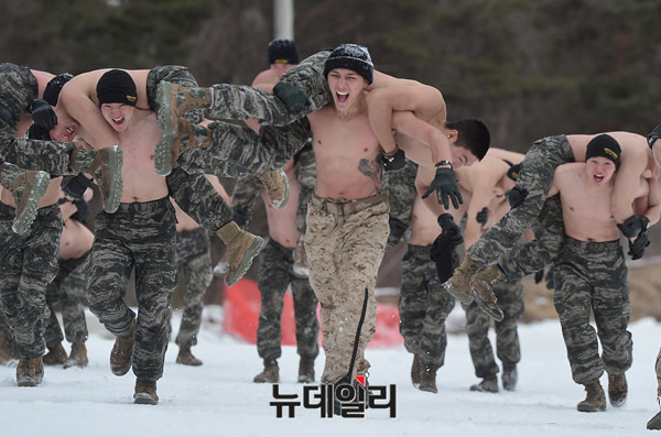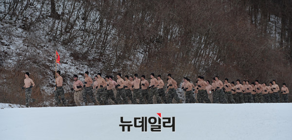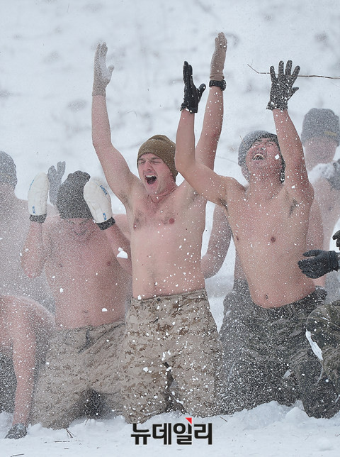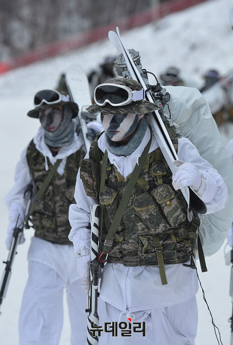 해병대 수색대대와 美 해병대 3사단 소속 수색중대의 '한미연합 설한지 훈련'이 28일 강원 평창 황병산에 위치한 해병대 산악종합훈련장에서 언론에 공개됐다.