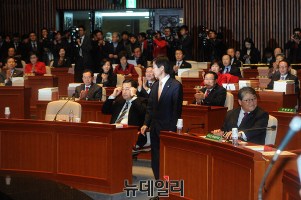 더불어민주당을 탈당하고 새누리당에 입당한 조경태 의원이 29일 오후 여의도 국회에서 열린 새누리당 의원총회에서 입당 인사를 위해 단상에 오르고 있다.