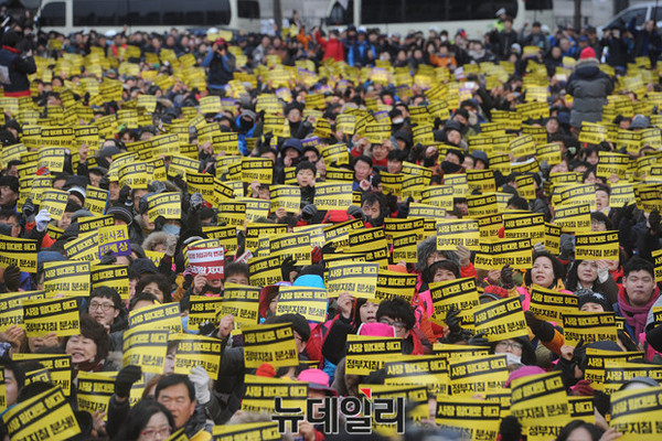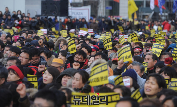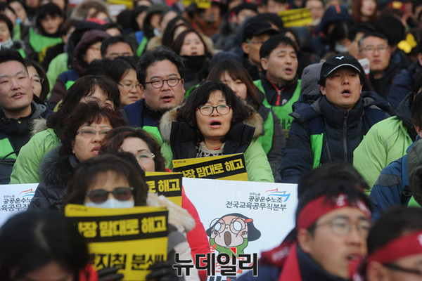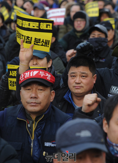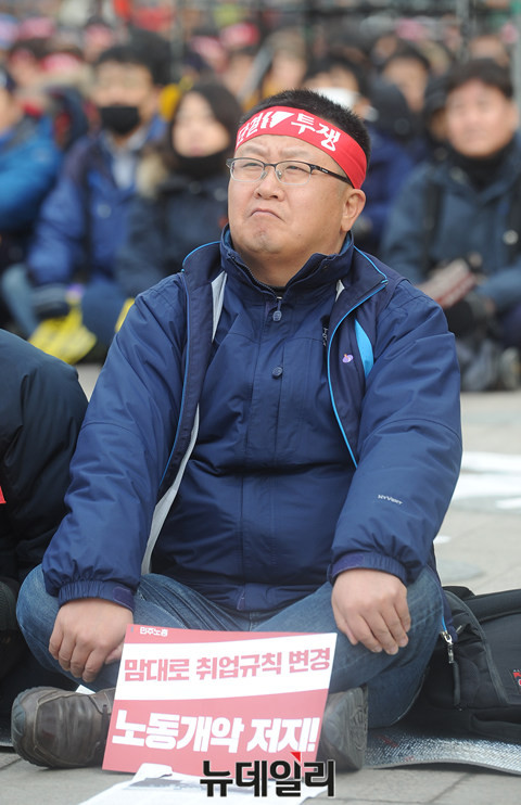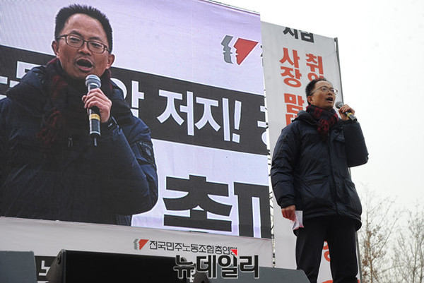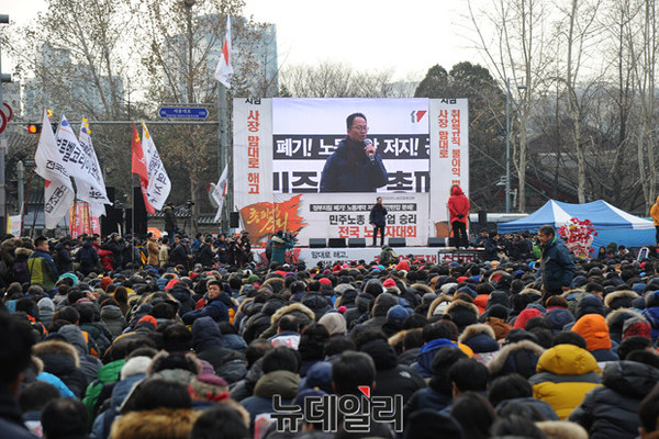 30일 오후 서울 중구 태평로 서울광장에서 열린 '민주노총 총파업 승리 전국 노동자대회'에서 시위 참가자들이 구호를 외치고 있다.