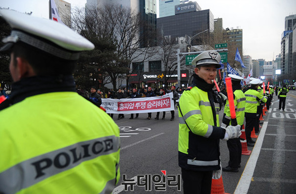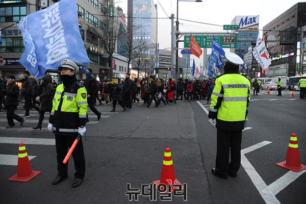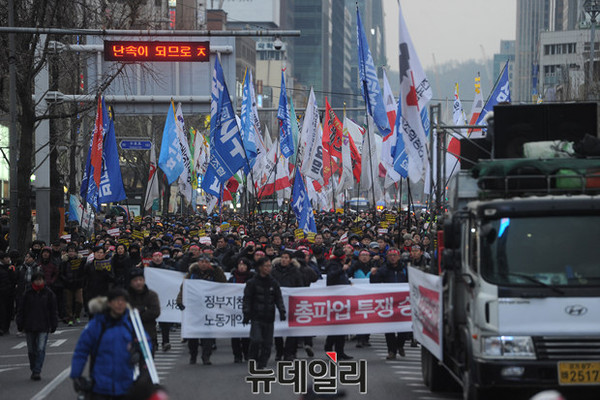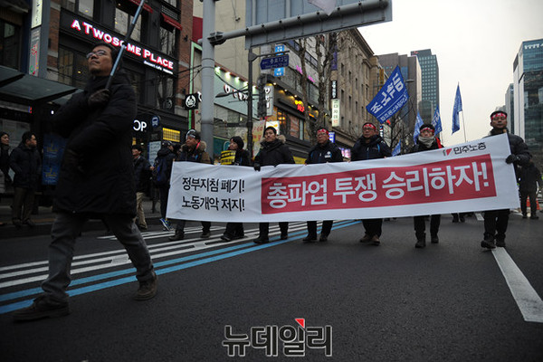 '민주노총 총파업 승리 전국 노동자대회'가 30일 오후 서울광장에서 열린 가운데 참가자들이 정부의 '일반 해고'와 '취업규칙 변경' 양대 지침 철회를 요구하며 거리 행진을 하고 있다.