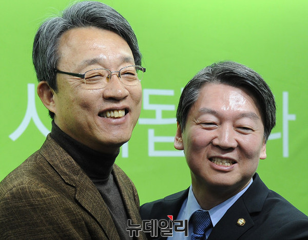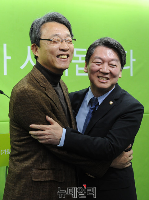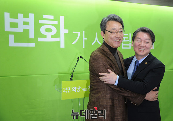 안철수 인재영입위원장은 "내가 하는 한 가장 훌륭한 정치인 중 한 분"이라며 "천군만마를 얻은 것 같다"고 말했다. 안철수 위원장과 김성식 전 의원이 입당 기자회견을 마친 직후 포옹을 하고 있다.
