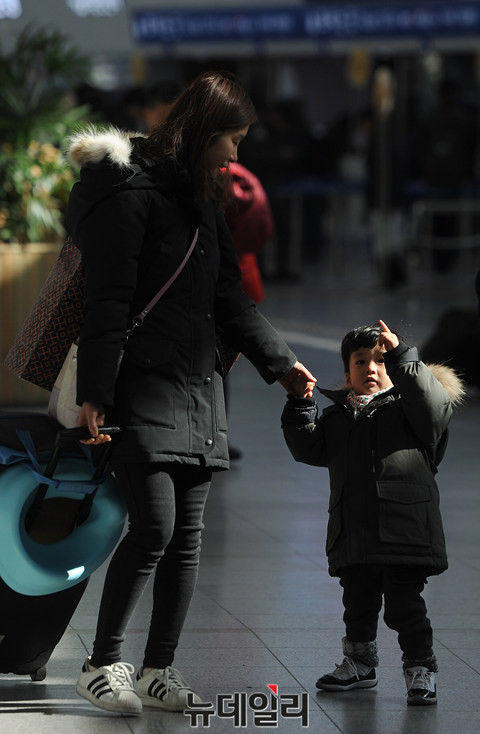 설 연휴을 하루 앞둔 5일 오후 KTX 서울역에 엄마와 아기가 고향가는 기차를 타러 가고 있다.
