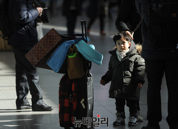 민족대명절인 설 연휴를 하루 앞둔 5일 오후 서울역에는 엄마를 따라 고향으로 향하는 아기가 설레임 가득한 표정을 짓고 있다.