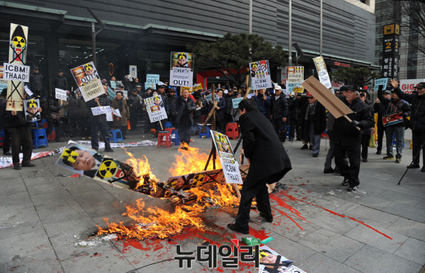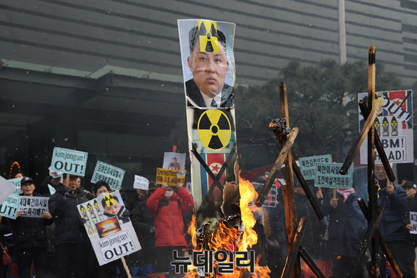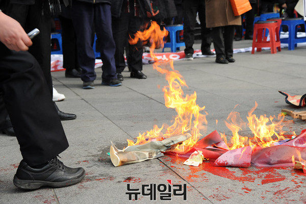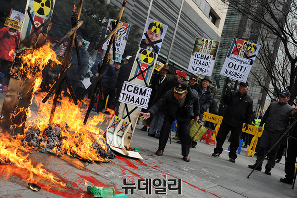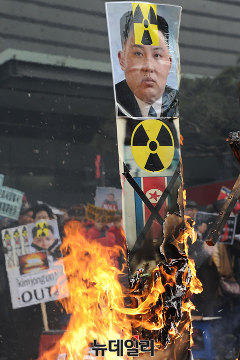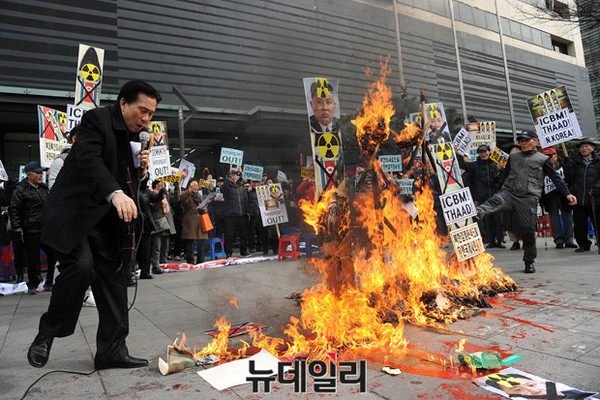 어버이연합을 비롯한 애국단체 회원들이 11일 오후 서울 광화문 KT앞에서 북한 4차 핵실험과 대륙간 장거리 미사일 발사를 규탄하는 기자회견을 열고 화형식 퍼포먼스를 하고 있다.