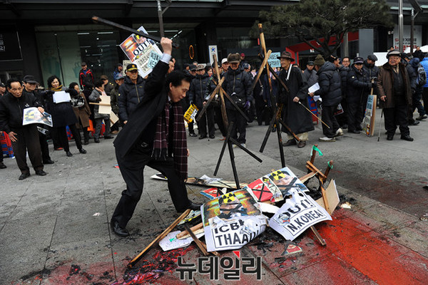 어버이연합을 비롯한 애국단체 회원들이 11일 오후 서울 광화문 KT앞에서 북한 4차 핵실험과 대륙간 장거리 미사일 발사를 규탄하는 기지회견을 열고 김정은 화형식 퍼포먼스를 하고 있다.