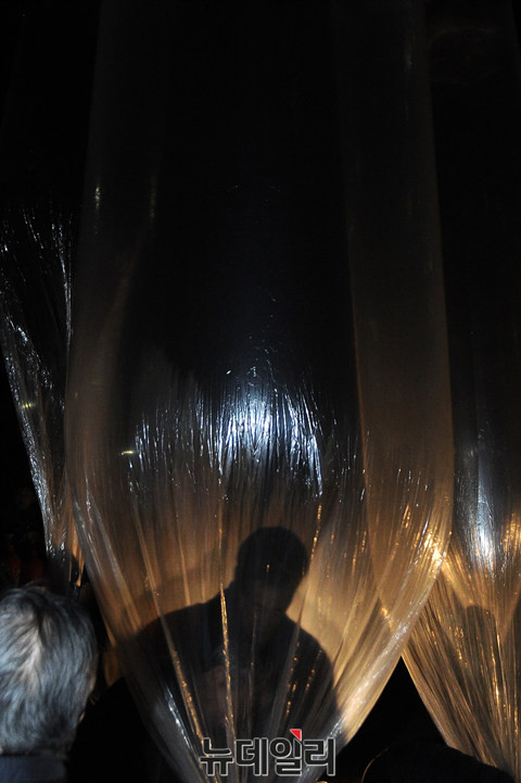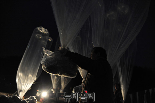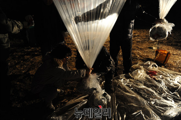 ' 유상준 단장과 북한인권운동가 강재천씨 등이 11일 오후 경기도 파주 인근의 한 공터에서 대북전단 살포 작업을 벌이고 있다.