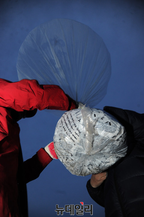 ' 유상준 단장과 북한인권운동가 강재천씨 등이 11일 오후 경기도 파주 인근의 한 공터에서 대북전단 살포 작업을 벌이고 있다.