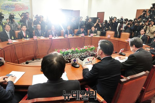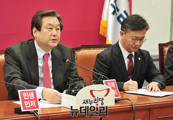 새누리당 김무성 대표최고위원이 12일 오후 서울 여의도 국회 당 대표실에서 정기섭 개성공단기업협회장 등 협회 관계자를 접견하고 있다.