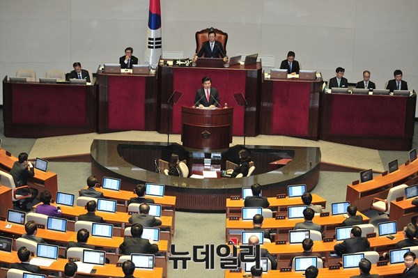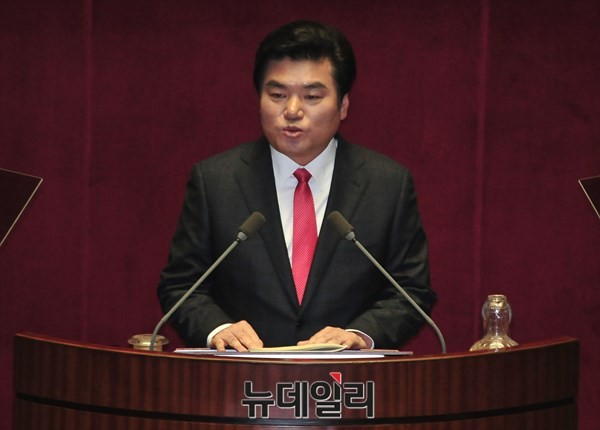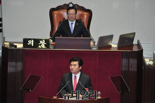 새누리당 원유철 원내대표가 15일 오전 서울 여의도 국회 본회의장에서 교섭단체 대표 연설을 하고 있다.