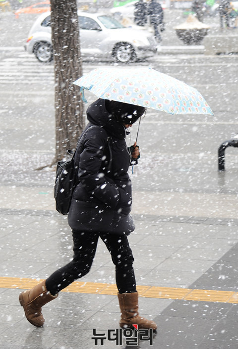 서울과 중부지방에 눈이 내린 16일 오전 서울 광화문광장에 시민들이 갑작스럽게 내린 눈을 맞으며 걸음을 재촉하고 있다.