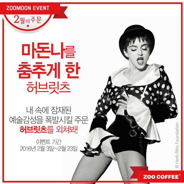 '마돈나를 춤추게 한 허브릿츠' 사진전이 주커피와 공동 프로모션 이벤트를 실시한다.오는 23일까지 진행되는 이번 이벤트는 주커피(ZOO COFFEE) 페이스북에 '좋아요'를 누른 뒤 게시글에 댓글로 '허브릿츠'라고 남기면 된다. 당첨자는 26일에 발표할 예정이며, 경품으로 허브릿츠 전시회 티켓을 증정한다.'마돈나를 춤추게 한 허브릿츠'는 할리우드의 전설로 불리던 사진작가 허브릿츠(Herb Ritts)의 작품 전시회이다. 그는 보그, 엘르, 하퍼스 바자 등 패션 매거진에 가장 많은 표지 사진을 실었고 마돈나, 마이클 잭슨, 니콜 키드먼, 넬슨 만델라 등의 전성기를 사진으로 남겨 이름을 알렸다.특히, 1986년 한 장의 사진으로 마돈나를 '팝의 여왕' 자리에 올리면서 최고의 포토그래퍼로서의 명성을 얻었다. 허브릿츠가 에이즈로 죽었을 때 추도사를 했던 마돈나는 "말 한 마디로 내 옷을 벗기고, 추운 모래밭에서 바보처럼 뛰게 했던 사람"이라며 그의 죽음을 슬퍼했다.풋풋하고 새로운 스타들의 다양한 모습들을 감상할 수 있는 '마돈나를 춤추게 한 허브릿츠'는 5월 2일까지 세종문화회관에서 열린다.