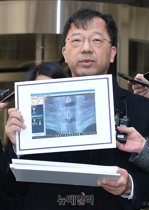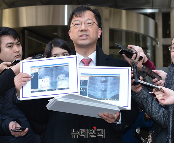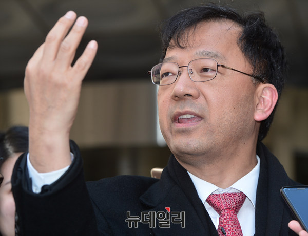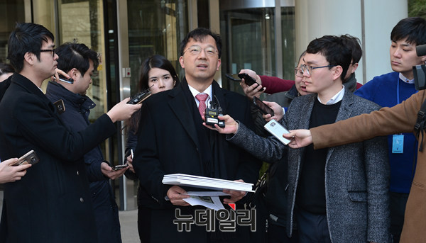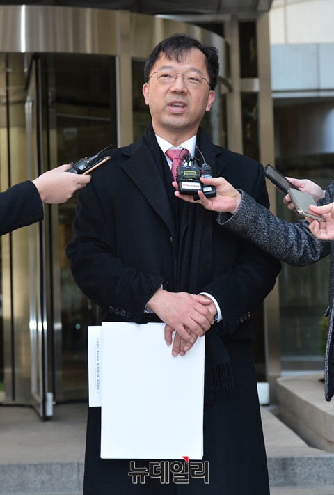 서울중앙지법 형사 합의 27부(재판장 심규홍 부장판사)가 17일 오후 서울중앙지법 311호 법정에서 박원순 서울시장 아들 박주신 병역비리 의혹이 사실이 아니라며, 양승오 박사 등 시민 7명에 대해 700~1,500만원의 벌금형을 선고했다. 선고 직후 차기환변호사가 기자들의 질문에 답하고 있다.