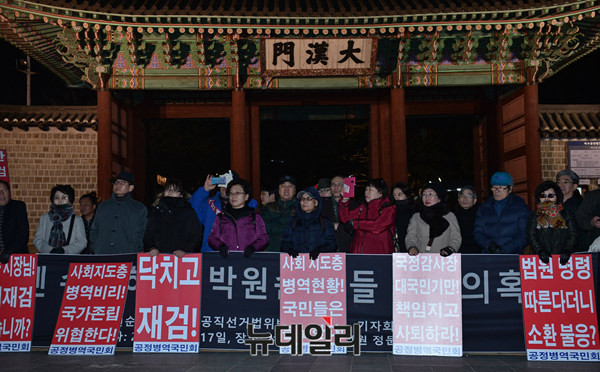 '공정한 병역의무 이행을 위한 국민총협의회'가 17일 오후 서울 중구 대한문 앞에서 '박원순 서울시장 아들 병역비리 의혹 해결을 위한 최대집~회' 기자회견을 열었다.