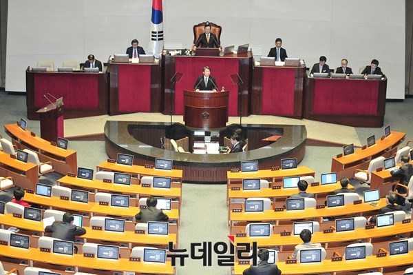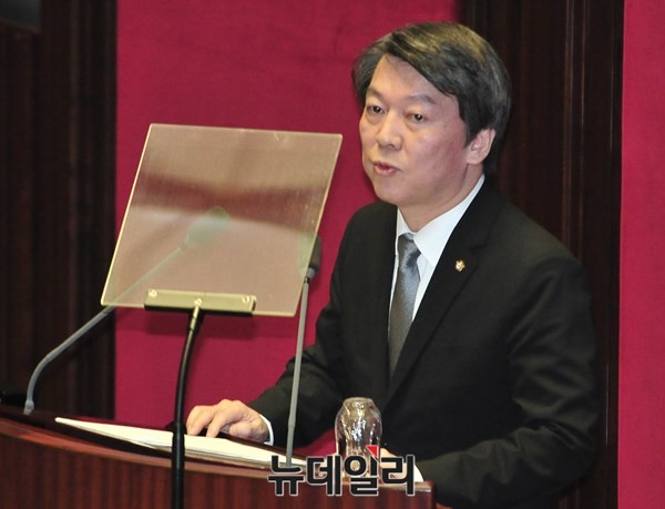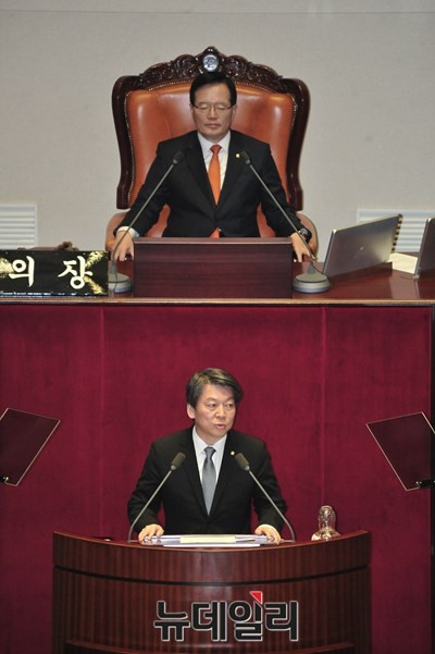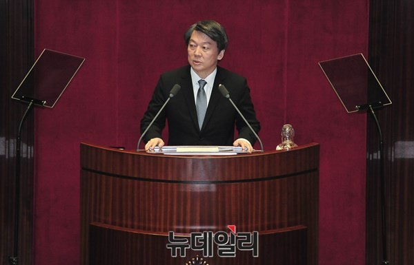 국민의당 안철수 대표가 18일 오전 서울 여의도 국회 본회의장에서 비교섭단체 대표발언을 하고 있다. 국회법 제104조 2항에 따라 원내교섭단체의 대표는 40분 동안 교섭단체대표연설을 할 수 있도록 보장돼 있지만, 비교섭단체에 대해서는 같은 법 5항에서 "교섭단체에 속하지 아니하는 의원의 발언 시간은 의장이 각 교섭단체 대표의원과 협의해 정한다"고 돼 있을 뿐이다. 우리 정치권은 이 조항에 근거해 관례적으로 비교섭단체 대표에게 '발언'을 허용하고 그 시간을 15분으로 정하고 있다. 이날 안철수 대표도 이에 근거한 15분 간의 비교섭단체 대표'발언'을 했다.
