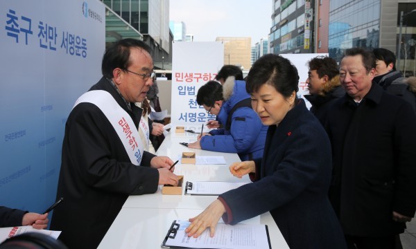 박근혜 대통령은 지난 1월 18일 경기도 성남시 판교역 광장에서 대한상의·전경련·무역협회 등 38개 경제단체와 시민단체가 중심이 돼 진행 중인 ‘민생구하기 입법 촉구 1000만 서명운동’에 참여하여 서명을 했다. 이 나라 헌정사상 특정 법안 처리와 관련하여 현직 대통령이 민간의 서명운동에 참여하고 독려한 것은 이번이 처음인 것 같다. 대통령이 나서서 입법 권력을 틀어쥔 국회를 압박하는 ‘대국민 직접 정치’의 새로운 전형을 보여준 것이다.