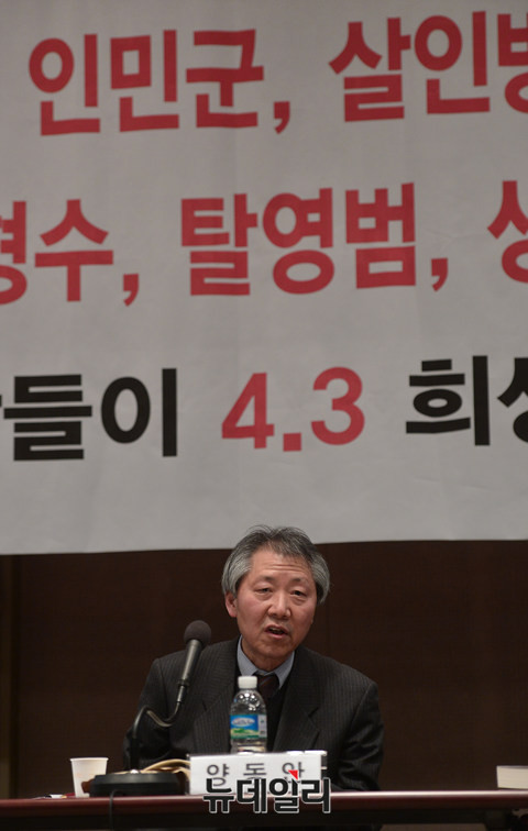 제주4.3사건진상규명국민모임이 18일 오후 한국프레스센터 국제회의실에서 '제주4.3 불량희생자 재심사 촉구 세미나'를 열고, 제주4.3사건 정상화를 촉구했다. 양동안 교수가 '제주4.3 불량위패에 대한 고찰'을 주제로 발표하고 있다.