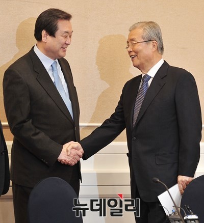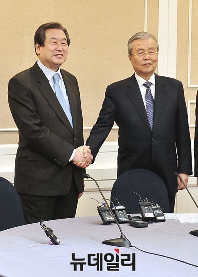 김무성 새누리당 대표와 김종인 더불어민주당 비대위 대표가 18일 오후 서울 여의도 국회본청 귀빈식당에서 열린 여야 4+4 회담에 앞서 악수를 나누고 있다.