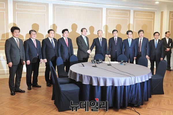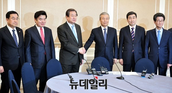 김무성 새누리당 대표와 김종인 더불어민주당 비대위 대표 등 여야 지도부가 18일 오후 서울 여의도 국회본청 귀빈식당에서 열린 여야 4+4 회담에서 기념사진을 촬영하고 있다.
