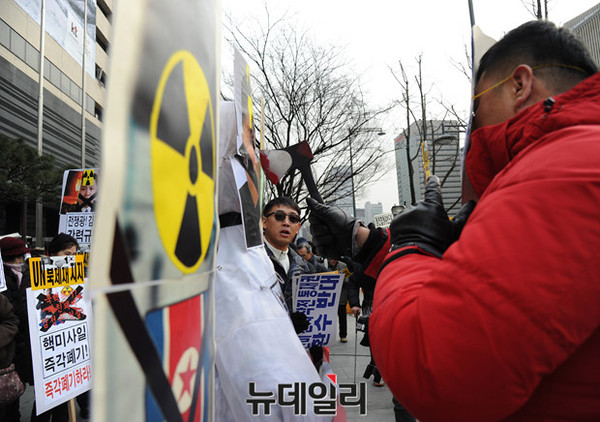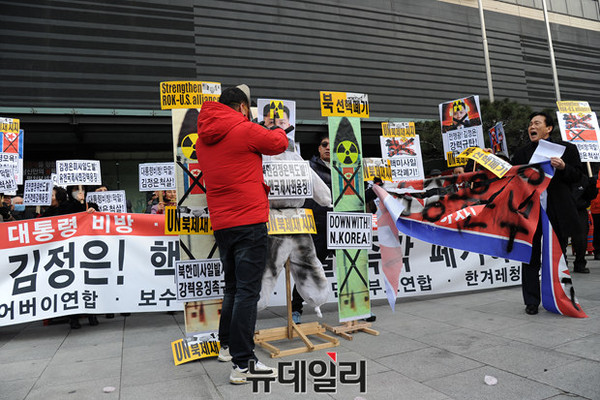 어버이연합을 비롯한 애국단체 회원들이 22일 오후 서울 광화문 KT앞에서 북한 핵실험과 대륙간 장거리 미사일 발사를 규탄하는 기자회견을 열고 김정은을 향해 도끼 퍼포먼스를 하고 있다.