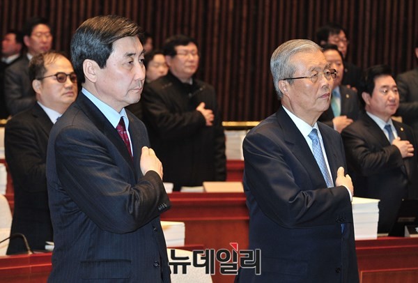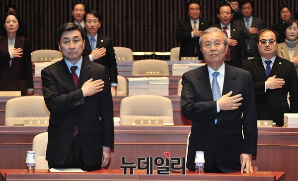 더불어민주당 김종인 비상대책위원장과 이종걸 원내대표가 23일 오후 서울 여의도 국회 본청에서 열린 의원총회에서 국기에 경례하고 있다.