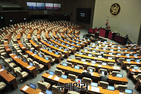 더불어민주당이 테러방지법 저지를 위해 피리버스터를 발동한 가운데 24일 오후 서울 여의도 국회에서 열린 본회의장에 여당 국회의원 3명, 야당 국회의원 5명, 공무원 11명이 자리를 지키고 있다.
