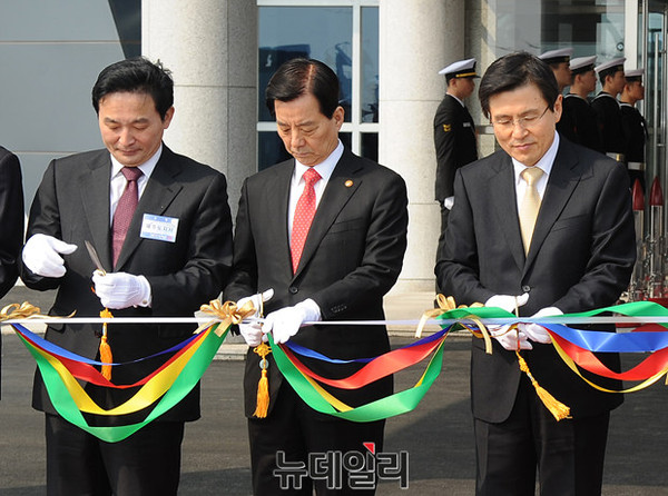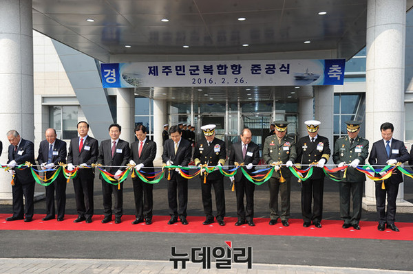 황교안 국무총리가 26일 오후 제주 서귀포 제주해군기지에서 열린 제주민군복합항 준공식에서 테이프커팅을 하고 있다.