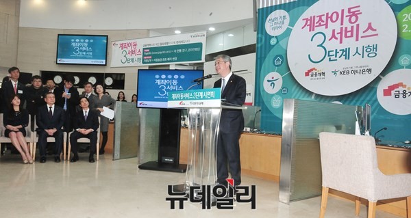 임종룡 금융위원장이 25일 서울 명동 KEB하나은행 본점 영업부에서 열린 계좌이동서비스 3단계 시연행사에서 축사를 하고 있다.